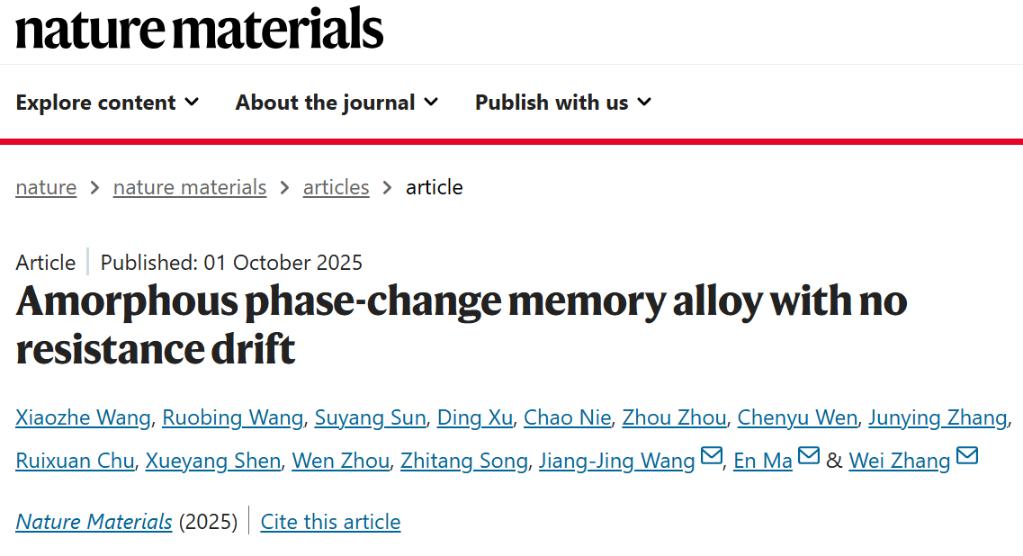 2025年 10月1日,《自然材料》(Nature Materials) 在线发表了“无电阻漂移的非晶相变存储材料Amorphous phas...