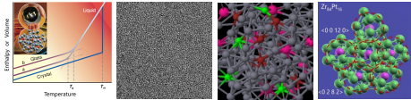 图1 液态浇铸获得的非晶态合金与其内部结构。左一:液体快速冷却时跃过晶化而成为玻璃态。其外观如通常合金,但内部无晶体结构:高分辨电镜照片如左二所示。第一性原理分子动力学模拟得到的内部局域原子构型如右侧两幅图所示。其中原子间绘制的短线并非表示定向键合,而是用于暗示原子与其最近邻原子之间的直接接触关系,构成配位多面体。不同颜色的球代表不同的化学元素,比如,右图中粉色为Pt、绿色为Zr。该非晶合金的结构看似无序,而虚线勾画的模体标示了该结构中的代表性基元。