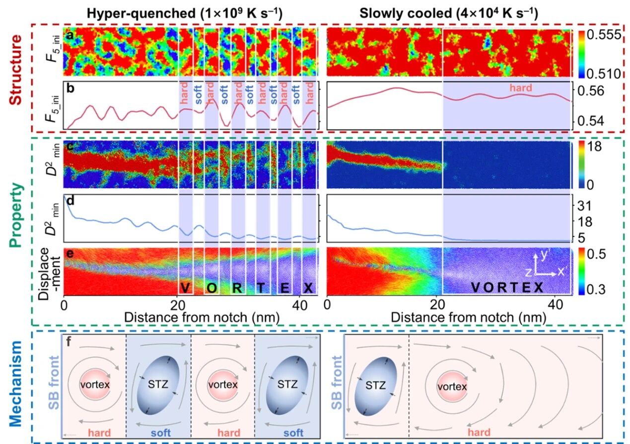 该研究首次从原子层面揭示了结构状态对剪切带传播机制的决定性作用。这些发现为非晶合金中剪切带的初始形成与传播的微观动力学提供了全新见解,强调了如何通过调节金属玻璃结构状态来控制剪切带行为。这为优化非晶合金的机械性能以满足特定工程应用需求带来了新的机遇。