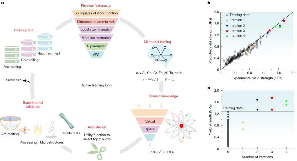 图1. (a)基于领域知识的机器学习模型(主动学习循环由六个步骤组成)预测具有超强塑性的FeNiCoAlTa复杂合金,(b)理论预测屈服强度与实验测量屈服强度相符合,证实了机器学习模型的可靠性,(c)实验测量屈服强度与模型迭代次数的关系,发现了最优成分的Fe35Ni29Co21Al12Ta3复杂合金。