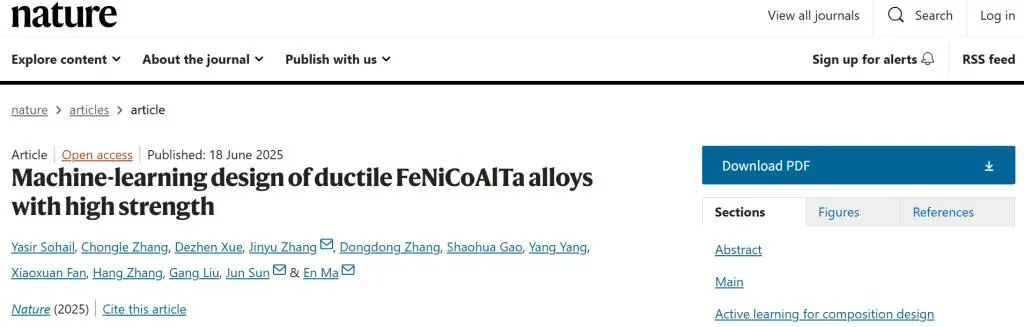 论文标题:Machine-learning design of ductile FeNiCoAlTa alloys with high strength(机器学习设计具有高强度塑性的合金)