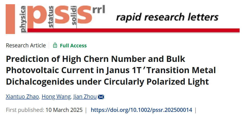 Link:Prediction of High Chern Number and Bulk Photovoltaic Current in Janus 1T′ Transition Metal Dichalcogenides under Circularly Polarized Light - Zhao - 2025 - physica status solidi (RRL) – Rapid Research Letters - Wiley Online Library