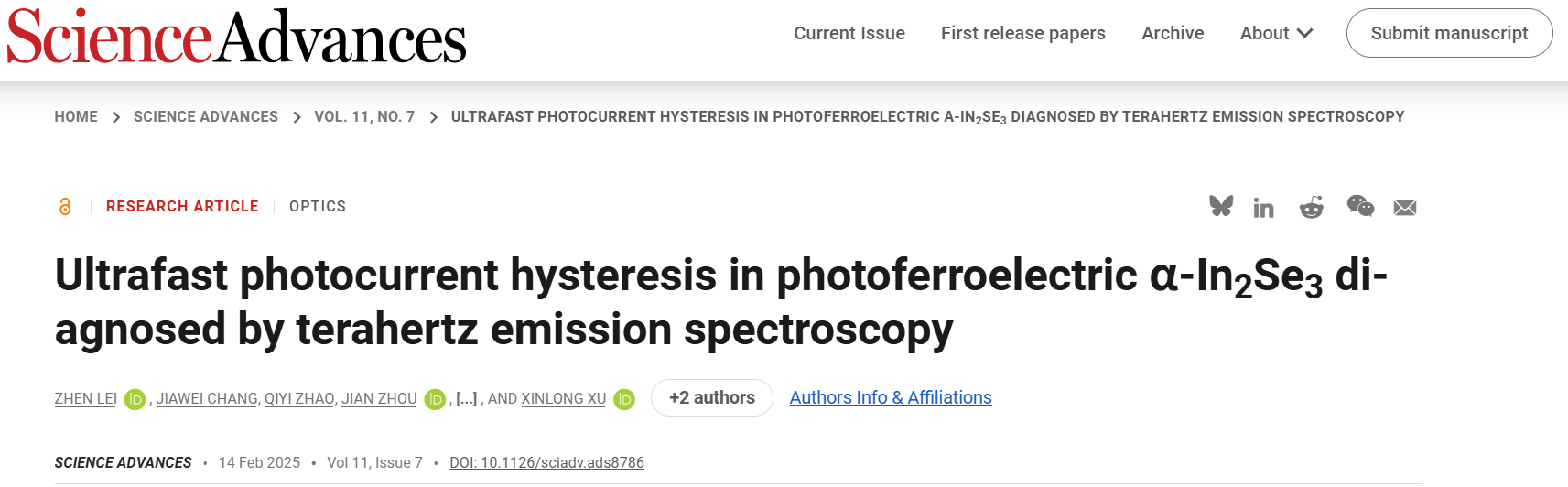 Link:Ultrafast photocurrent hysteresis in photoferroelectric α-In2Se3 diagnosed by terahertz emission spectroscopy | Science Advances