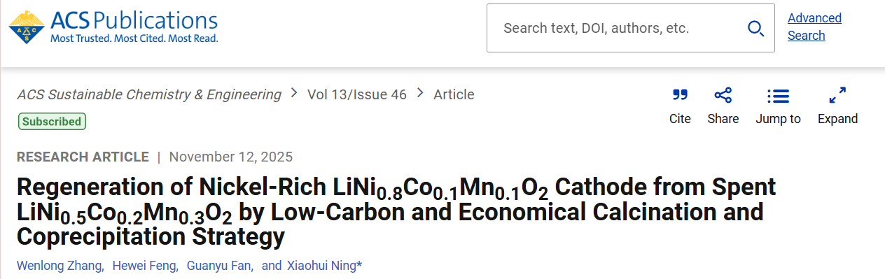 Link:Regeneration of Nickel-Rich LiNi0.8Co0.1Mn0.1O2 Cathode from Spent LiNi0.5Co0.2Mn0.3O2 by Low-Carbon and Economical Calcination and Coprecipitation Strategy | ACS Sustainable Chemistry & Engineering