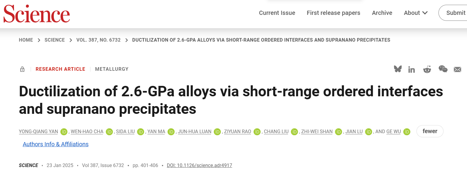 Link:Ductilization of 2.6-GPa alloys via short-range ordered interfaces and supranano precipitates | Science
